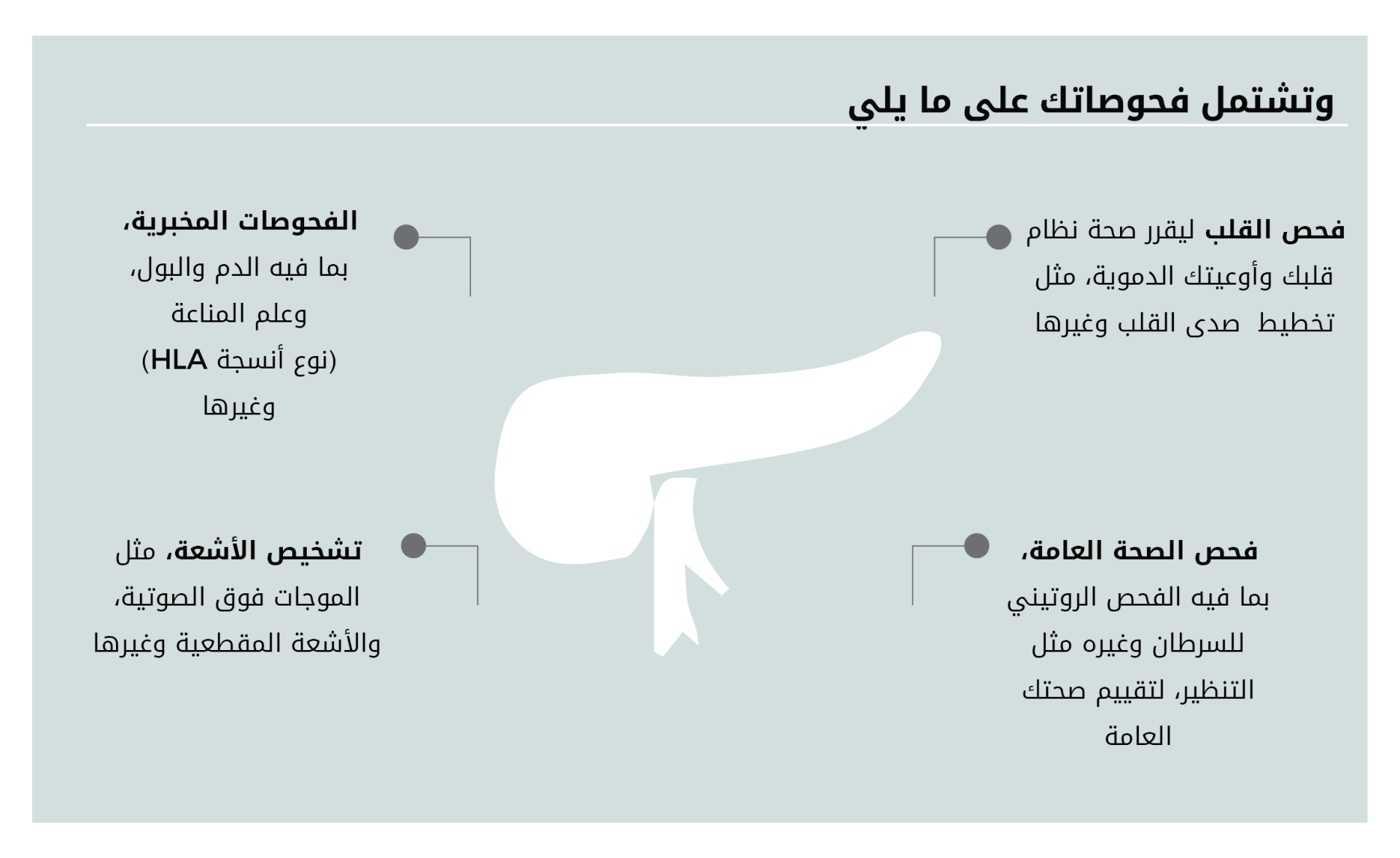 لتقرر ما إذا كنتَ مؤهلاً لزراعة البنكرياس، يجب عليك أولاً إجراء تقييم لإجراء عملية الزراعة. وتساعد هذه الخطوة المهمة لتقرر ما إذا كانت زراعة الأعضاء هي الإجراء الصحيح لصحتك. وخلال عملية التقييم، سوف تلتقي بالعديد من أعضاء فريق الزراعة، بمن فيهم الأطباء والجراحون، والخدمة الاجتماعية، والتغذية، وغيرهم. كما ستلتقي بمنسق زراعة الأعضاء الذي سيساعدك خلال عملية التقييم. وخلال تقييمك، يُطلب منك إجراء فحص طبي إضافي. وبعد الانتهاء من تقييمك، ستُقدم حالتك الصحية والتاريخ إلى لجنة الزراعة. ويستغرق التقييم مدة تتراوح بين شهر - شهرين تقريبًا.