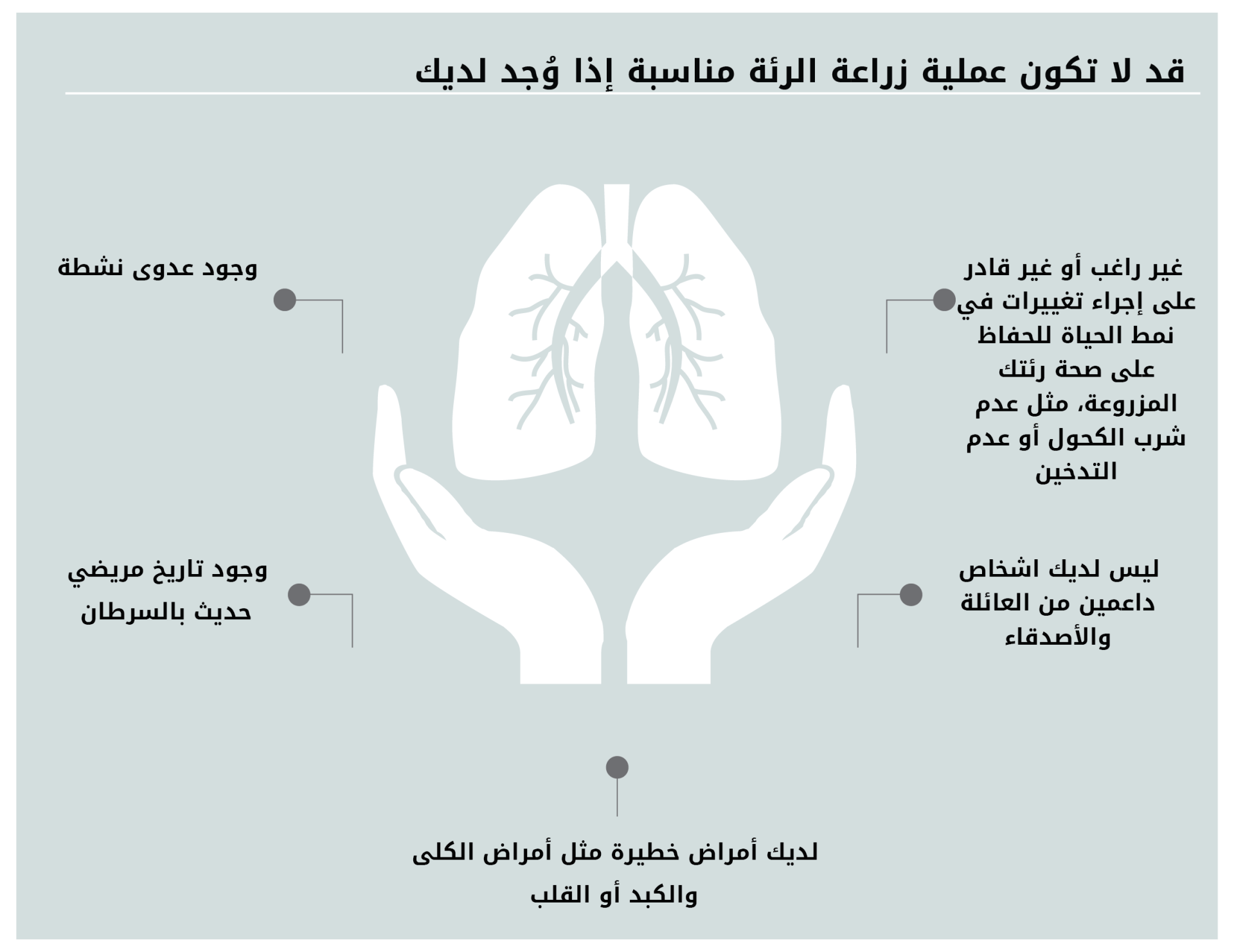 ليست زراعة الرئة علاجاً مناسباً للجميع. قد تؤكد بعض العوامل أنك لست مرشحًا جيدًا لزراعة الرئة. في حين، يتم اعتبار كل حالة على حدة من قبل مركز الزراعة، قد لا تكون عملية زراعة الرئة مناسبة إذا وُجد لديك: