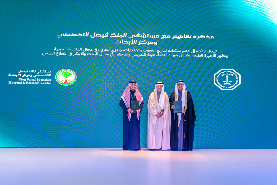 بحضور صاحب السمو الملكي الأمير عبدالعزيز بن سلمان بن عبدالعزيز؛ وزير الطاقة ورئيس مجلس أمناء جامعة الملك فهد للبترول والمعادن، وقع مستشفى الملك فيصل التخصصي ومركز الأبحاث مذكرة تفاهم مع جامعة الملك فهد للبترول والمعادن، صباح اليوم الأحد، بهدف توسيع نطاق التعاون البحثي والابتكار الطبي، وتطوير الأجهزة والتقنيات الطبية الحيوية والصحة الرقمية، في خطوة تستهدف تعزيز ريادة المملكة العربية السعودية في مجال البحث والتطوير الطبي عالميًا، وذلك في مقر الجامعة بالظهران.