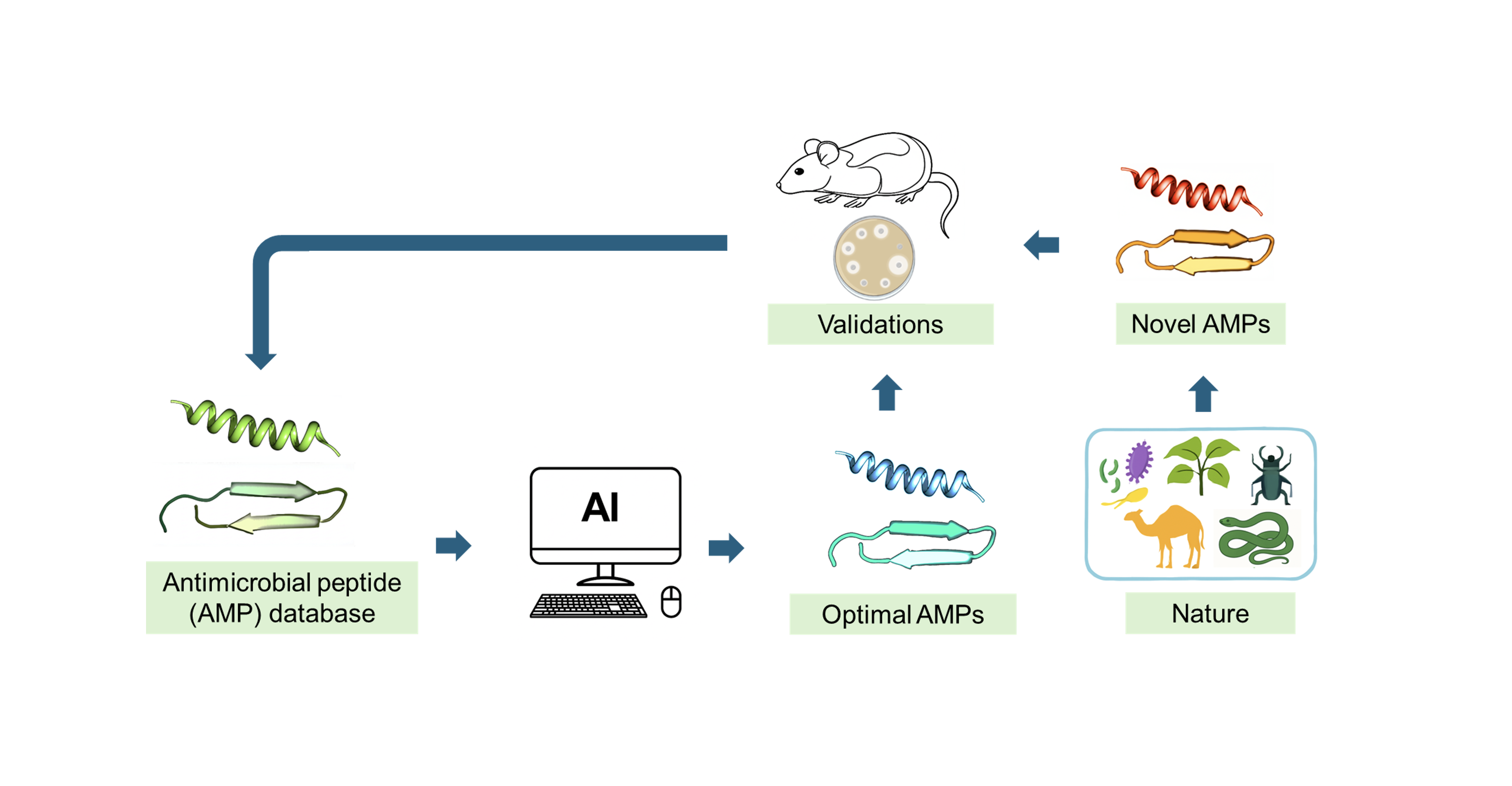We are also working on discovering novel antimicrobial agents from natural sources. This involves two methods: the direct extraction of antimicrobial compounds from various organisms and the use of genome sequencing to identify the genetic code for new antimicrobial agents. By exploring the natural world, we aim to uncover previously unknown antimicrobial molecules that may offer unique mechanisms of action. Our strategy combines computational design with natural discovery, allowing us to build a comprehensive pipeline for the development of effective, next-generation antimicrobial treatments. The ultimate objective is to contribute to the global effort to combat antimicrobial resistance (AMR) by creating a new class of powerful and safe antimicrobial agents.