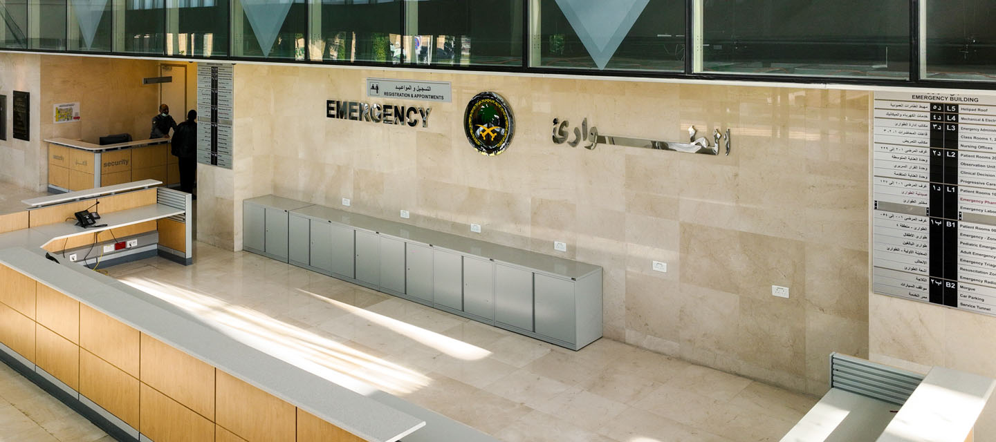 يتكون قسم الطوارىء من أربعة (4) أقسام طبية: الكبار، الأطفال، الرعاية الطارئة و خدمات الإسعاف، يقدم أعلى مستوى من الجودة والفعالية في حالات الطوارئ المتخصصة على مدار الـ 24 ساعة يوميًا لكل مريض مؤهل ، وبعد تقديم الخدمات المساعدة الطبية الأولية للمريض يتم إحالته إلى القسم المختص لمزيد من الرعاية. بحيث يوجد لدى الموظفين القدرة على التعامل مع أي نوع من حالات الطوارئ الداخلية والخارجية.